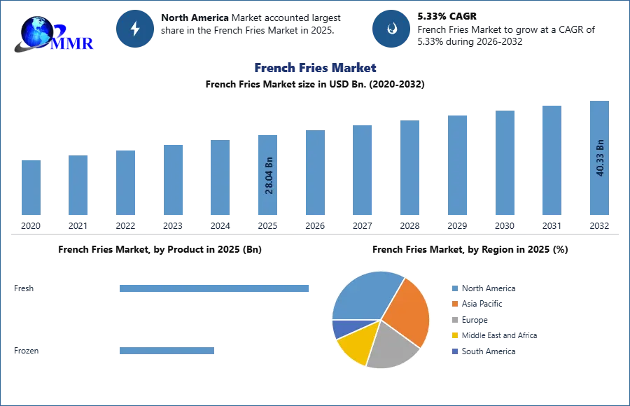 The global French fries market is witnessing robust growth, fueled by the increasing popularity of fast food, expanding quick-service restaurant (QSR) chains, and rising consumer demand for convenient and ready-to-eat food products. French fries remain one of the most widely consumed potato-based products worldwide, appealing to consumers across all age groups. The market is expected to expand steadily over the forecast period, supported by innovations in processing, packaging, and product offerings.